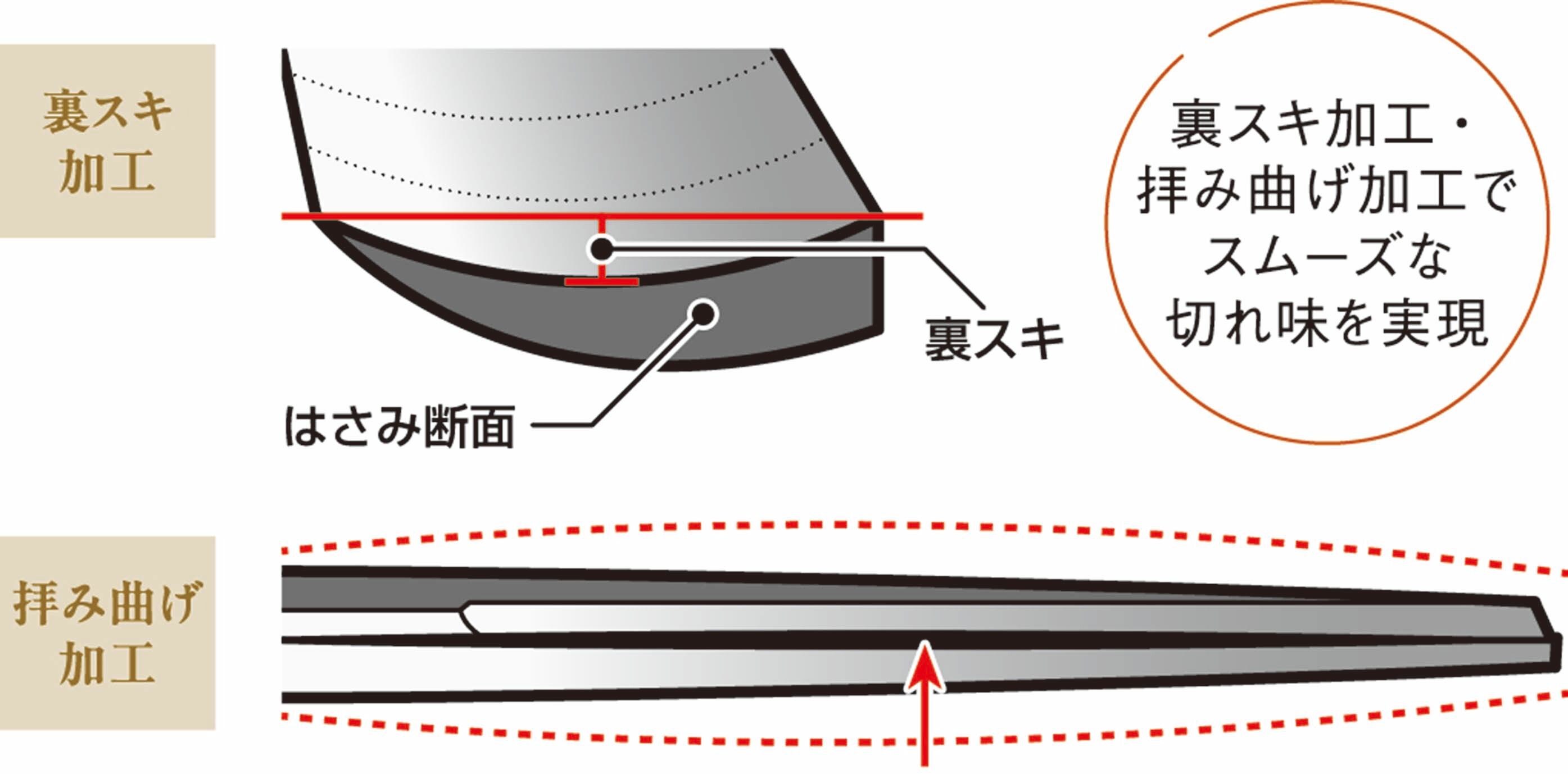 裏スキ加工・拝み曲げ加工でスムーズな切れ味を実現